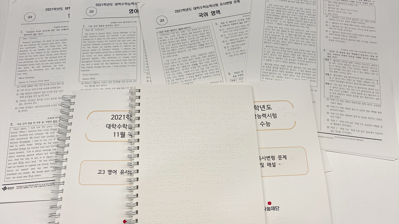 - 시각장애 학생에게 ‘문제집 한 권’은 단순한 참고서가 아닙니다. 점자 문제집을 신청해도 완성까지 평균 5개월이 걸려, 학기 전에 준비해도 중간고사가 지나서야 받아보는 경우가 많습니다. 그 사이 학생들은 예습은커녕 수업 진도에 맞춰 공부하는 것조차 버거운 시간을 보내게 됩니다. 공부하고 싶은 마음이 있어도, 자료가 없어서 시작조차 늦어지는 현실입니다.