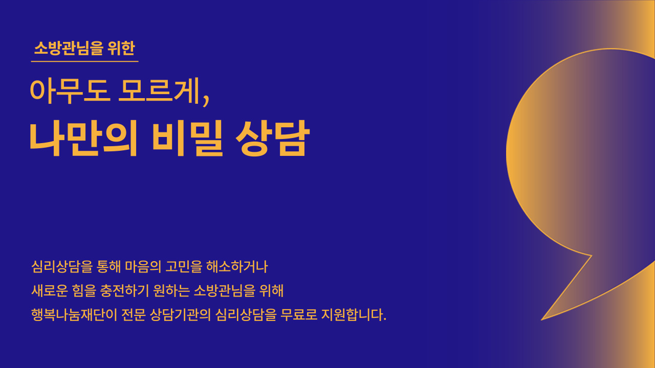 - 소방관들은 화재와 사고 현장을 반복해서 마주하며 극도의 스트레스 상황에 놓입니다. 하지만 ‘강해야 한다’는 인식과 조직 문화 속에서 마음이 힘들다는 신호를 쉽게 꺼내지 못합니다. 상담이 필요하다는 걸 알면서도, 절차와 시선에 대한 부담 때문에 참고 넘기는 경우가 많습니다.