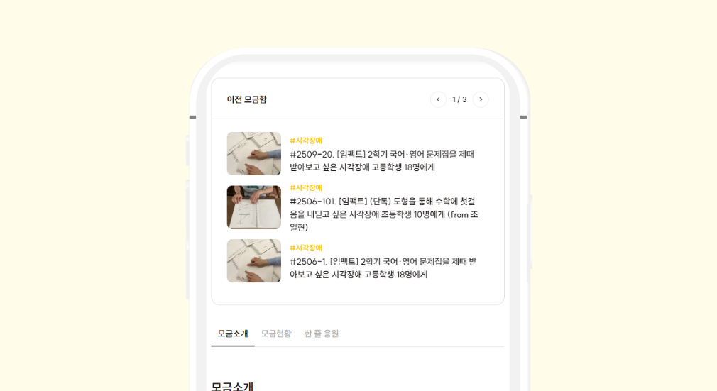 - 이번 모금은 시각장애 학생 32명이 새 학기를 제때 시작할 수 있도록 점자 문제집을 빠르게 제작·전달하는 프로젝트입니다. 단원별 분업 제작으로 시간을 줄이고, 완성된 단원부터 바로 제공해 학습 공백을 최소화합니다. 문제집 한 권이 만들어지면 앞으로 같은 학년에 진학할 다른 시각장애 학생들에게도 계속 사용됩니다. 제때 공부할 수 있도록 마음을 전달해주세요.