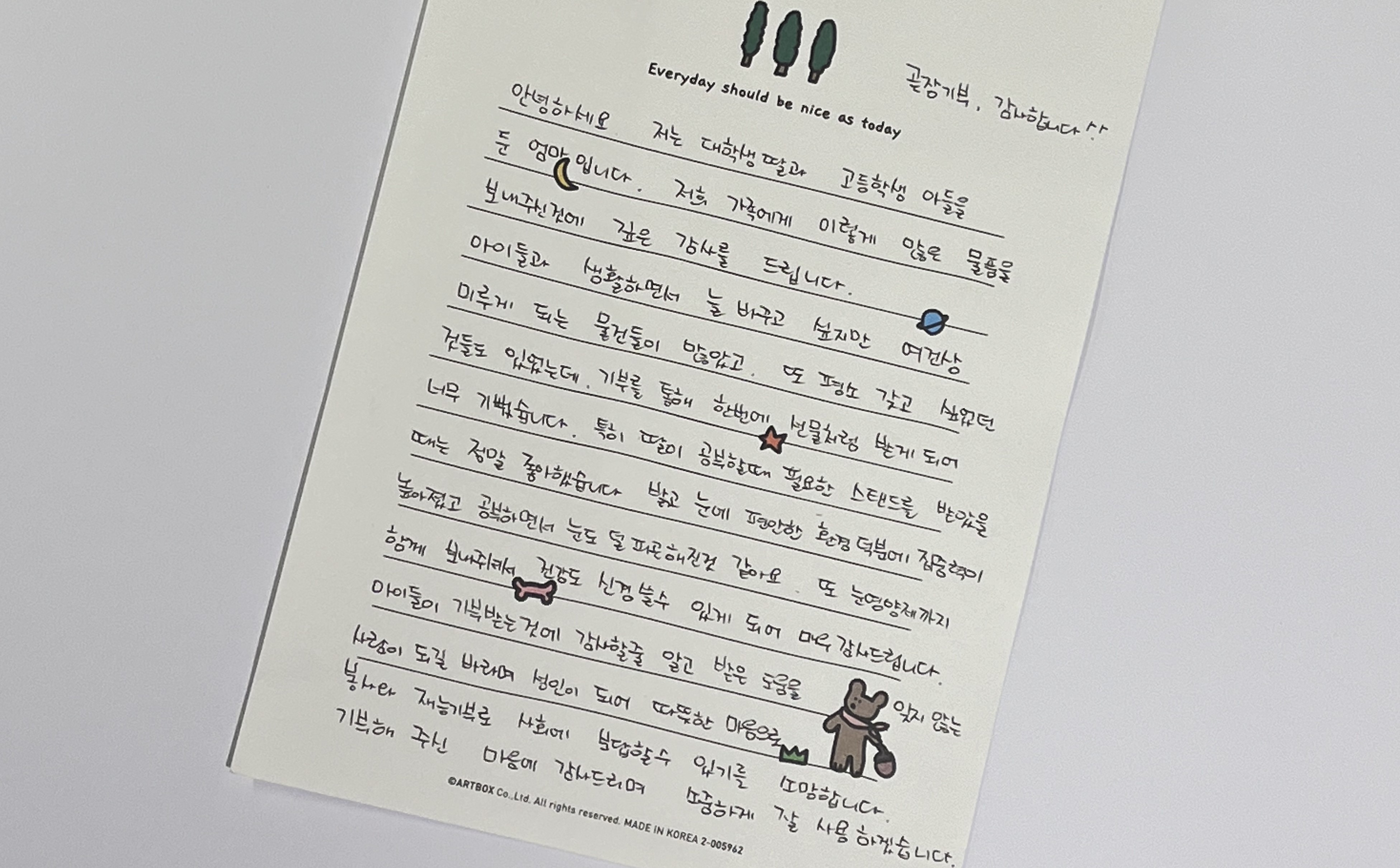 특히 딸이 공부할때 필요한 스탠드를 받았을때 정말 좋아했습니다. 밝고 눈에 편안한 환경 덕분에 집중력이 높아졌고, 공부하면서 눈도 덜 피곤해진 것 같아요. 눈영양제까지 함께 보내주셔서 건강도 신경쓸 수 있게되어 매우 감사드립니다. 아이들이 기부 받는것에 감사할 줄 알고, 받은 도움을 잊지않는 사람이되길 바라며 성인이 되어 따뜻한 마음으로 봉사와 재능기부로 사회에 보답할 수 있기를 소망합니다. 기부해주신 마음에 감사드리며 소중하게 잘 사용하겠습니다. |