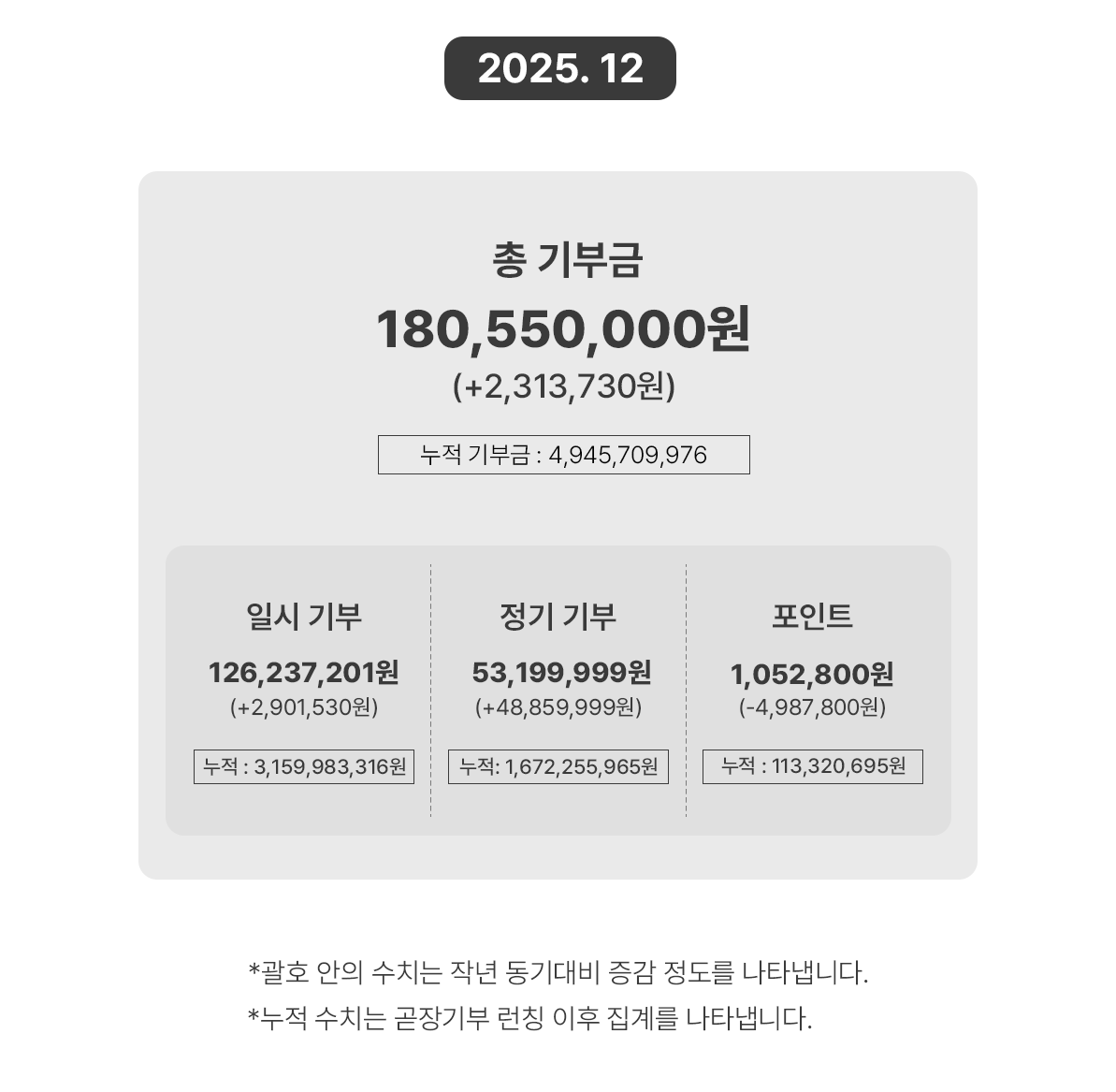 안녕하세요, 곧감님 ✨ 2025년 한 해도 곧장기부와 함께해 주셔서 감사해요. 곧감님이 보내주신 응원과 나눔 덕분에, 2025년 한 해 동안 누적 약 16억 4천 만원의 기부금이 모여 아이들과 여러 가정에 곧감님들의 따뜻한 마음을 전할 수 있었어요.